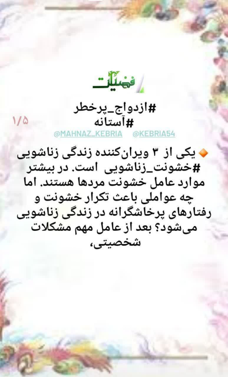 یکی از ۳ ویران‌کننده‌ زندگی زناشویی #خشونت‌_زناشویی است. در بیشتر موارد عامل خشونت مردها هستند. اما چه عواملی باعث تکرار خشونت و رفتارهای پرخاشگرانه در زندگی زناشویی می‌شود؟ بعد از عامل مهم مشکلات شخصیتی، یکی از عوامل تشدید کننده خشونت زناشویی، واکنش زن در نخستین باری است که توسط شوهر مورد خشونت کلامی یا جسمی واقع می‌شود.